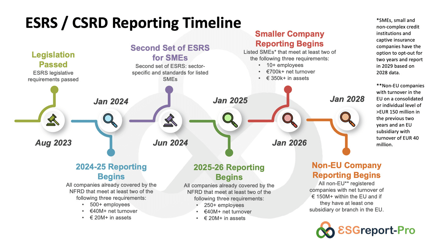 The rules initially only apply to large organisations, but the threshold for organisational size reduces each year. In 2025, entities with more than 500 staff must report for the year 2024, and in 2026, the company size reduces to 250+ staff for the reporting year 2025. In 2026, listed companies with 10 or more staff will need to report for 2025 and we may well see SMEs needing to make their first limited reports either then or the year after.